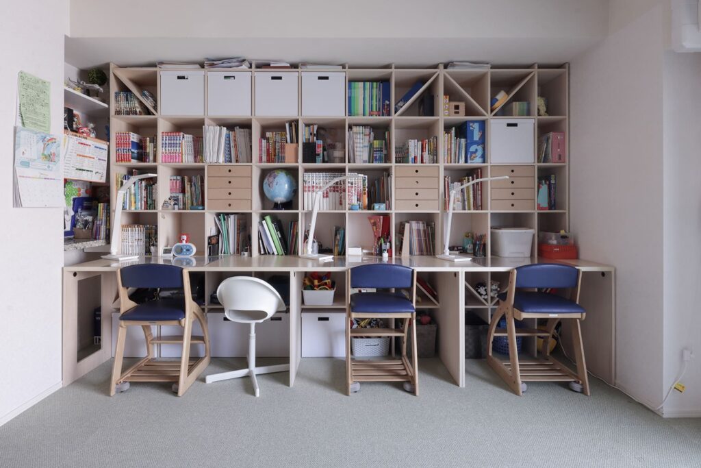 収納と作業スペースを一体で確保でき、教科書や参考書を手の届く位置に置きながら、すぐに学習机に向かえる環境をつくれます。