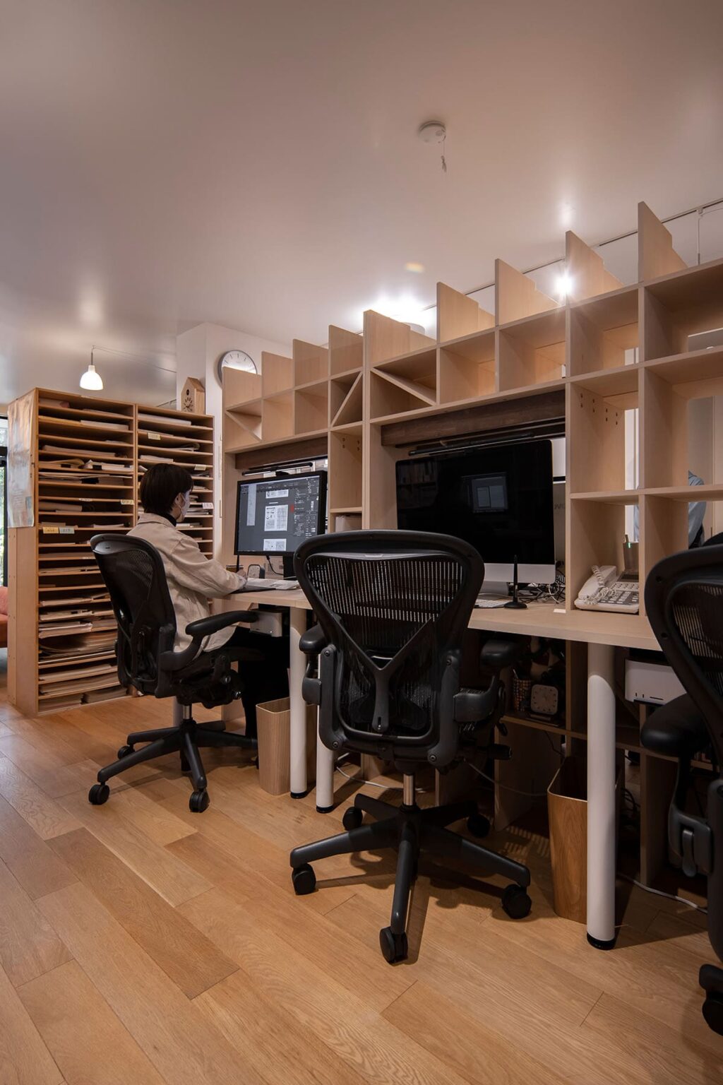 こちらの大学院の研究室では、同一シリーズの収納家具を複数使って大容量の書類や資料をすっきりと収納。