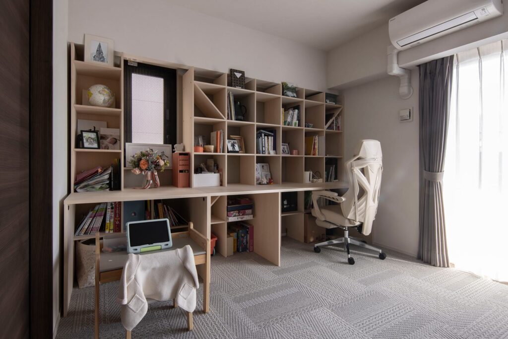 - リビング学習机の実例⑤ 学習机の付いた壁面本棚でコンパクトにレイアウト