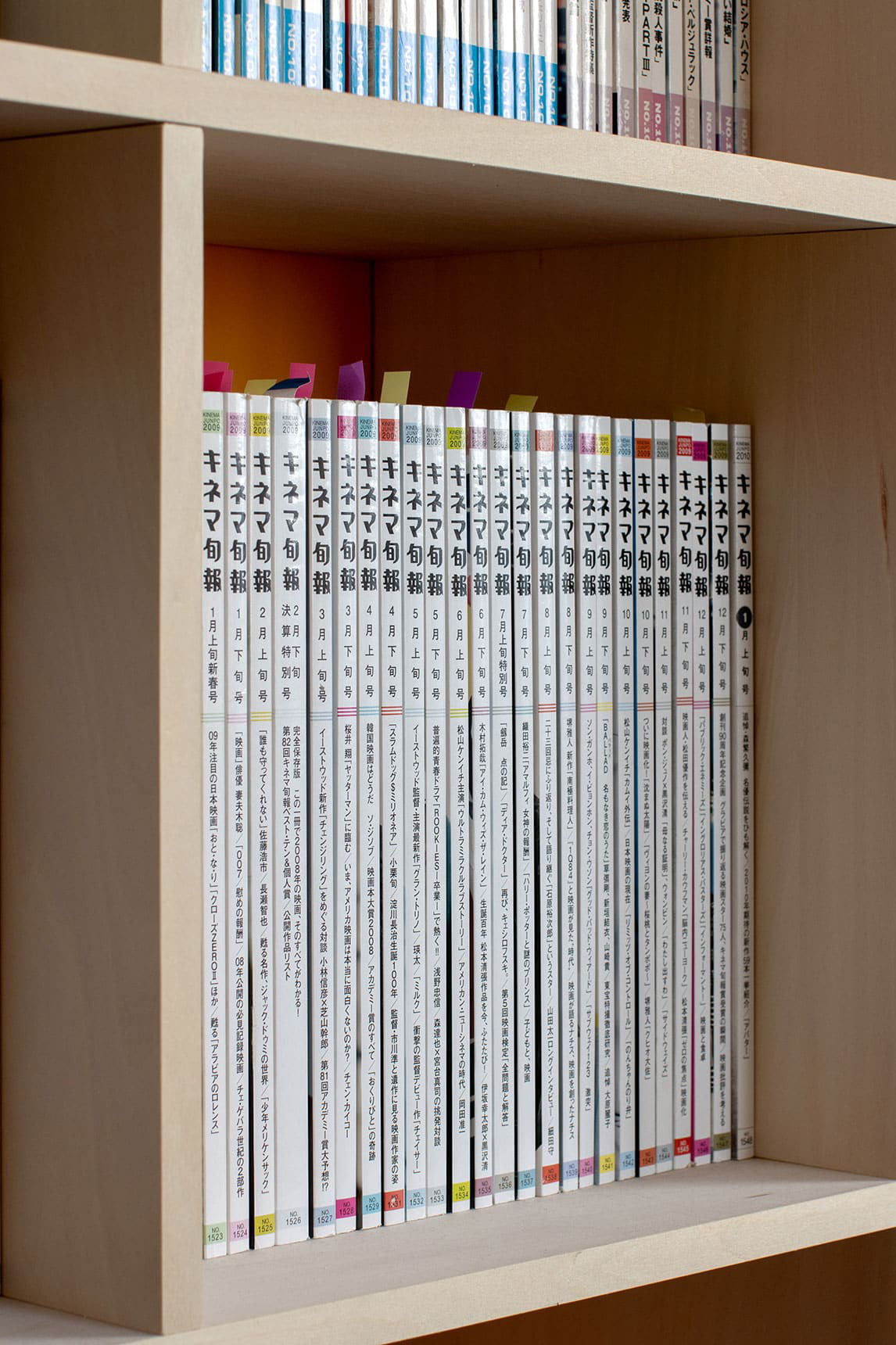 会議室には同じくオレンジ色を背景に「Shelf 壁一面の本棚 奥行350mm」を2台連結。創刊号から揃った『キネマ旬報』が整然と並び、圧巻のライブラリーを形成しています。業界の歴史を物語る書籍群が背景となることで、会議そのものが知的な重みを帯び、議論の場に奥行きを与えています。床材を木製フローリングとPタイルで切り分けることで、用途ごとに緩やかな境界が設けられ、空間の秩序も自然に生まれています。