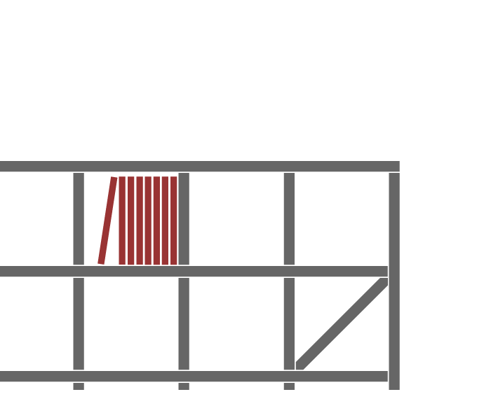 背面に巾木加工が施されているので、壁面にぴったりと沿わせて設置されています。壁際はほんの少しだけ床が上がっているケースが多いためそこに設置された本棚は前のめりになるケースが多いため縦材が床と接する部分には楔を噛ませてあります。この楔はこのように前のめりになるのを防ぐと同時に本棚全体を壁側(背面側)に傾けるので転倒防止としても有効に作用します。