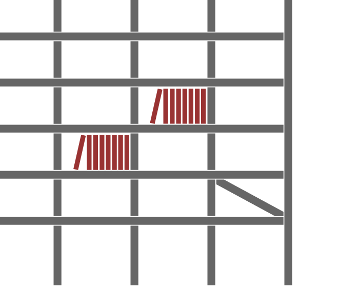 最上下段以外の1コマの内部有効寸法は、幅325×奥行180×高さ220mmあり、菊判やB5判などA5よりも少し大きな判型の蔵書も横に積み重ねて収納することが可能です。週刊の漫画誌はB5判でサイズは182×257mmなので、横に積み重ねるとわずかに棚板からはみ出しますが、この本棚には今は休刊となった貴重なB5判の自社漫画誌が7〜8冊ずつ横に積み重ねて収納されています。書籍などを横にして高く積み上げると、下のものを取り出すことが困難になりますが、この本棚では1コマの高さが220mmと決まっているため、際限なく上に積み重ねることにはなりません。取り出す際に動かさなければならない書籍の量は横板によって限定されているため、床から天井までの高さに積み上げることが可能でありながら、取り出しやすい収納が実現しています。