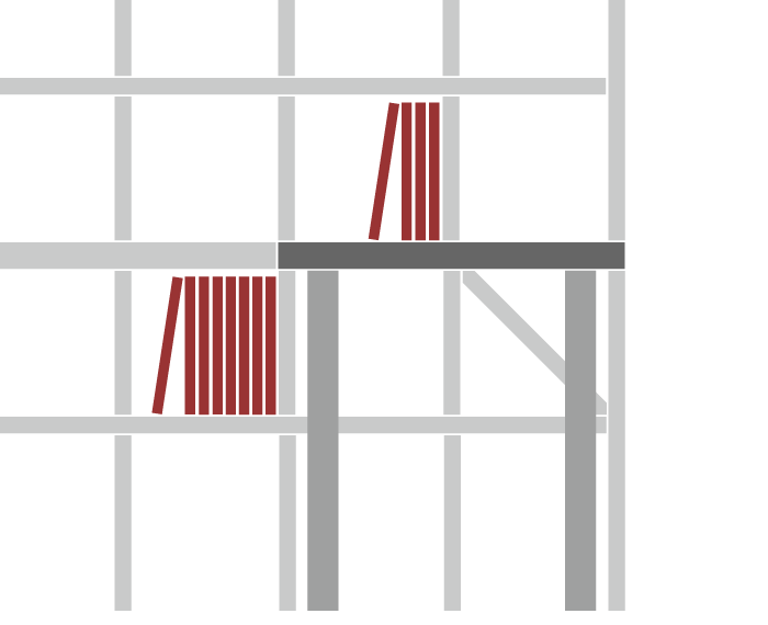 マルゲリータの本棚は床から天井までを全て活用して形成されるその圧倒的な収納力が魅力の一つです。棚板を組み合わされて形づくられたセルの中に蔵書などのコンテンツを収めると垂直の壁面いっぱいに「情報」を積み上げた景観が立ち上がります。これに直行する形でデスクが配置され、集積された情報をその上で組み合わせ、展開させるスペースとしているのがこのデスク付き本棚です。お使いいただく人はデスクの前に本棚と直行して座り広角の視界をデスクの先の空間に開いていくことができます。眼が疲れた時に遠くの景色を眺める休憩のひとときはもちろんのことですが、ふとした瞬間に思考の枠から離れて自由に想念を拡げていくきっかけが本棚とデスクとの位置関係から生まれてきそうです。