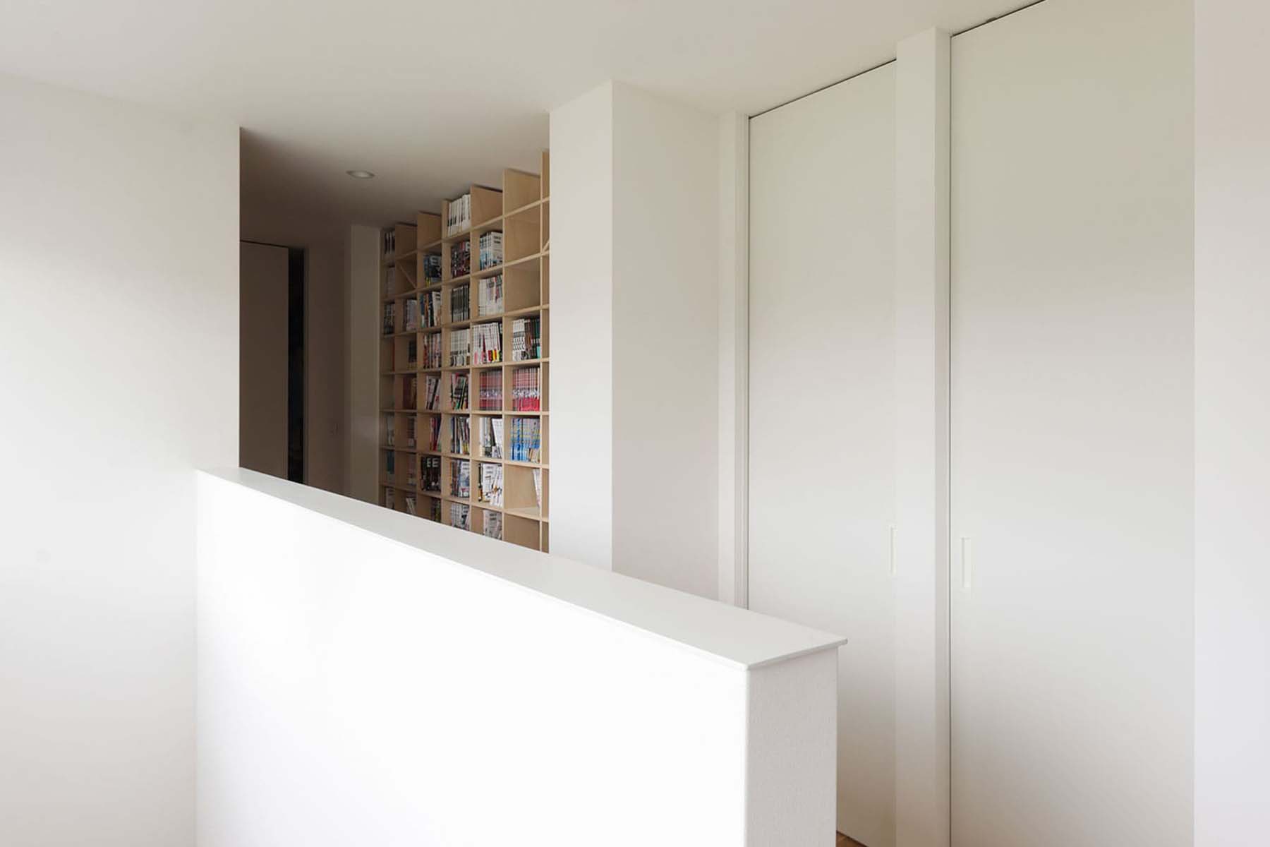 また、この本棚が廊下に設置されることを前提に住宅の設計を進められたため、白を基調とした壁面の一角に、コミック全集が美しく収まる専用のスペースが誕生し、シンプルな廊下が別の用途を併せ持つ魅力的な空間へと生まれ変わっています。